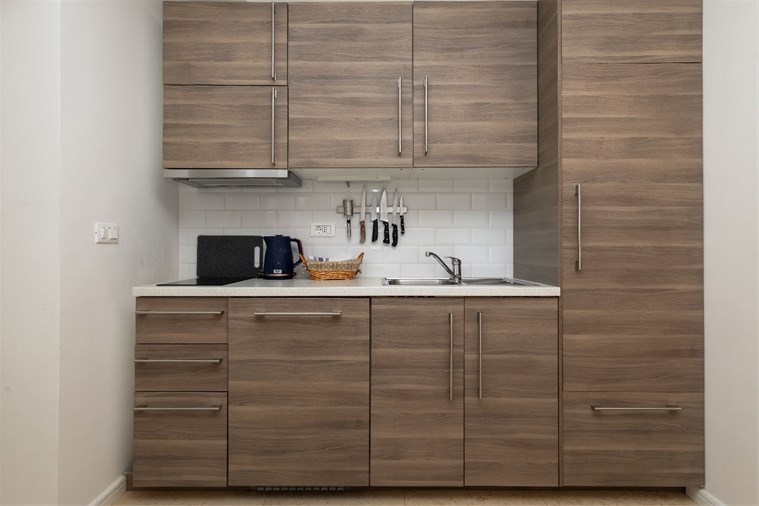 * Grundausstattung für die Küche mit Utensilien zur Zubereitung und zum Servieren von Speisen und Getränken, Besteck für alle Personen, Reinigungs- und Feuchttücher sowie Kühlschrank und Herd